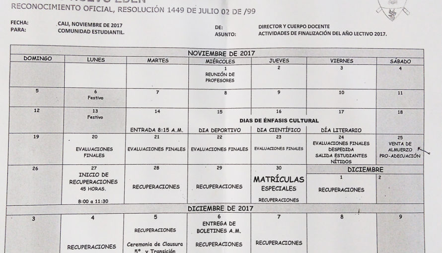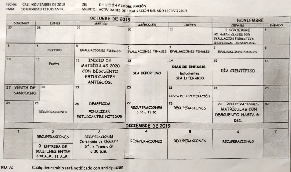 La dirección y coordinación del Colegio Nuevo Edén Cali, le informa a toda la comunidad estudiantil, que estas son las actividades de finalización del año lectivo 2019: